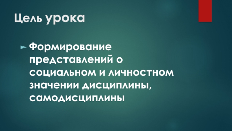 Цель урокаФормирование представлений о социальном и личностном значении дисциплины, самодисциплины