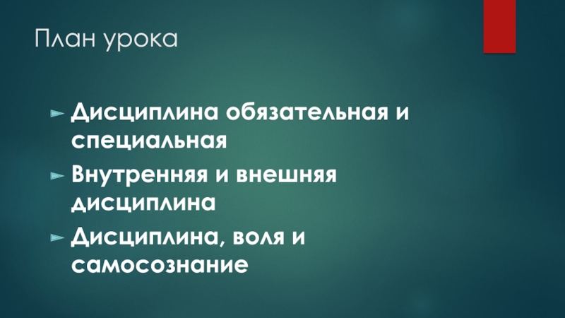 План урокаДисциплина обязательная и специальнаяВнутренняя и внешняя дисциплинаДисциплина, воля и самосознание