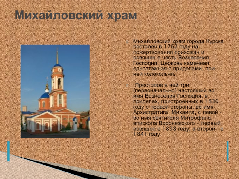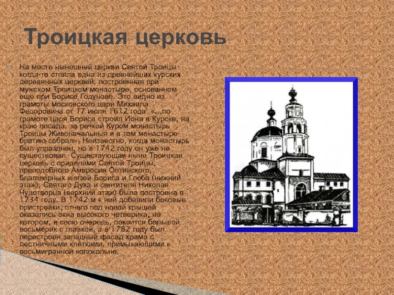Начало строительства – 1752 г., окончание - 1778г. Нижний (будничный) храм был! освящён в 1762г. во имя преподобного Сергия Радонежского, верхний (праздничный) - в 1778г. в честь Казанской иконы Божией Матери. В летописи собора об этом повествуется так: «В деле о церкви пишется, что заложен храм сей в 1752 году, но кем - сведений не имеется при соборе; а также нет на построение оного храма ни плана, ни фасада».