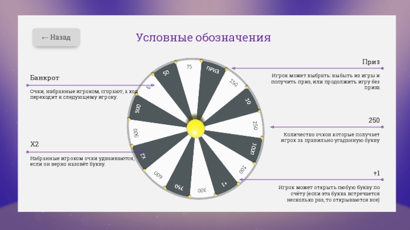 Игроки крутят барабан. Первый ход делает игрок, стоящий ближе всех к ведущему. Ему может выпасть сектор с каким-либо числом очков, которые он получит, если угадает букву, или специальный сектор.