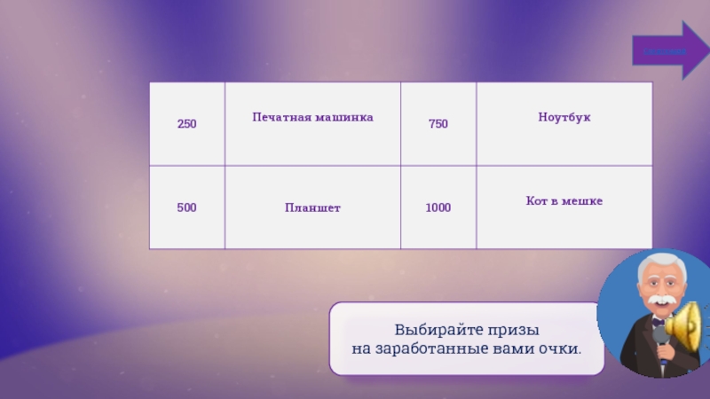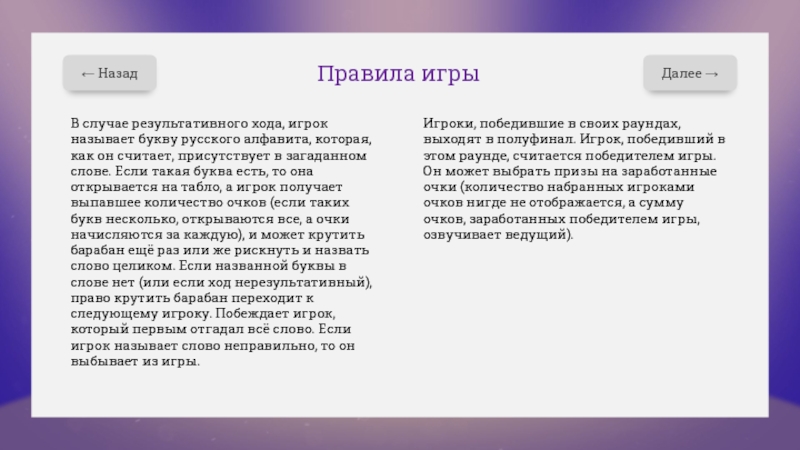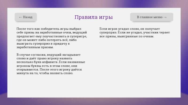 Если игрок угадал слово, он получает суперприз. Если не угадал, участник теряет все призы, выигранные по очкам.