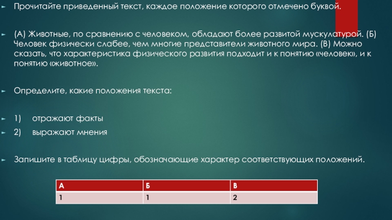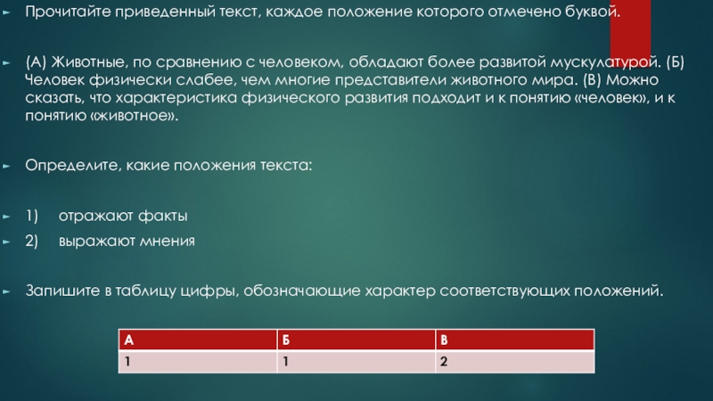 сравнению с человеком, обладают более развитой мускулатурой. (Б) Человек физически слабее, чем многие представители животного мира. (В) Можно сказать, что характеристика физического развития подходит и к понятию «человек», и к понятию «животное».