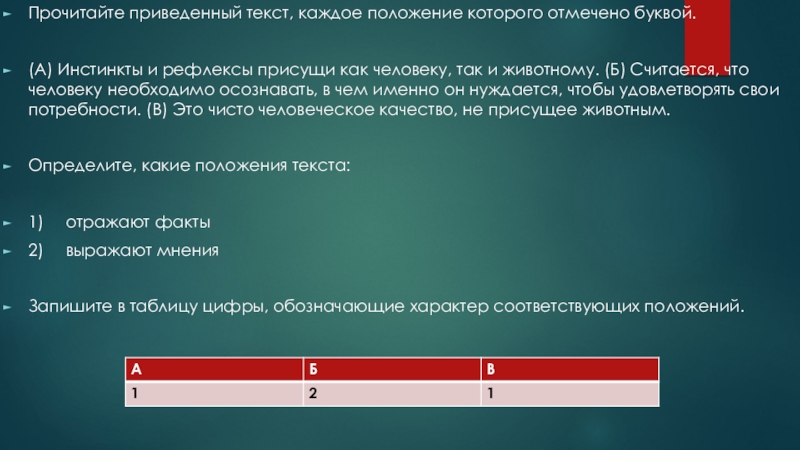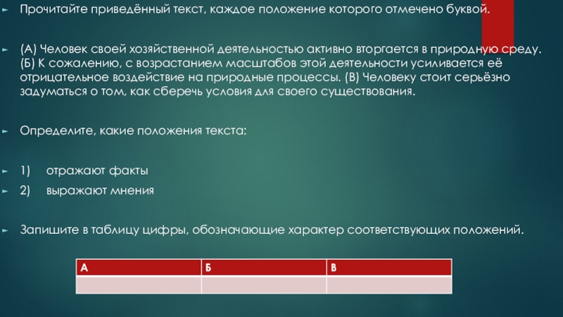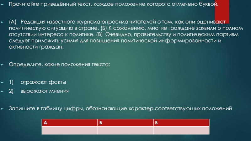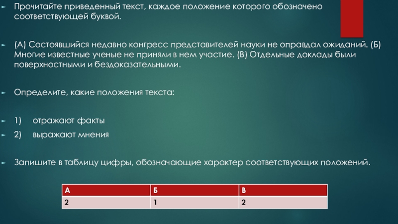 Слайд 12Прочитайте приведённый текст, каждое положение которого отмечено буквой.