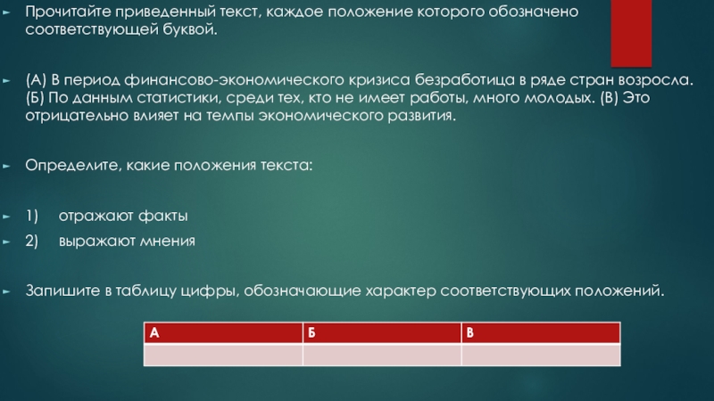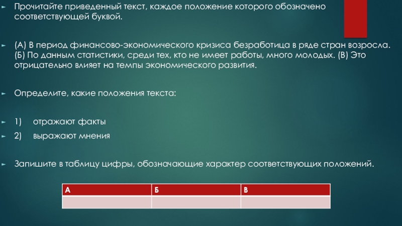 период финансово-экономического кризиса безработица в ряде стран возросла. (Б) По данным статистики, среди тех, кто не имеет работы, много молодых. (В) Это отрицательно влияет на темпы экономического развития.