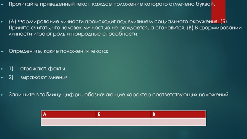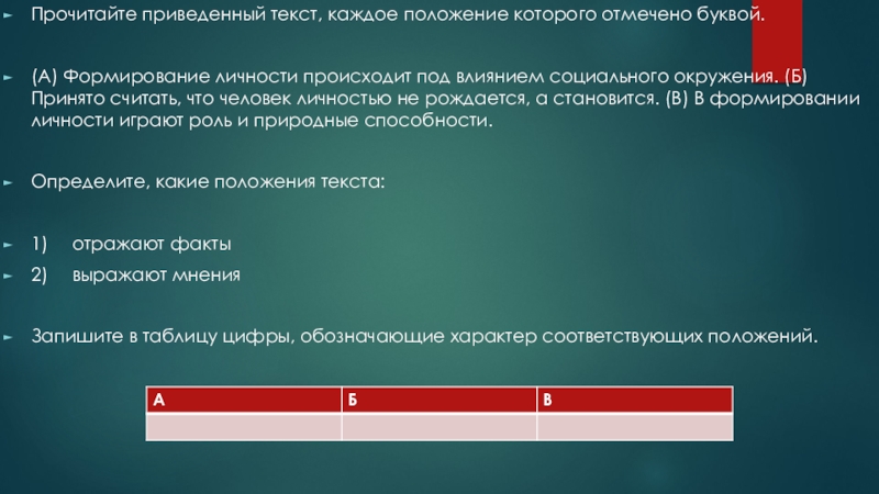 происходит под влиянием социального окружения. (Б) Принято считать, что человек личностью не рождается, а становится. (В) В формировании личности играют роль и природные способности.