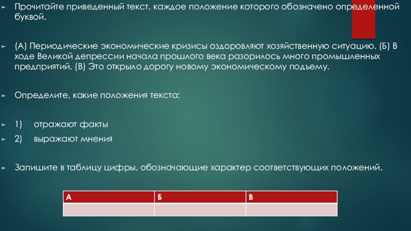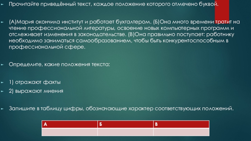 Слайд 10Прочитайте приведённый текст, каждое положение которого отмечено буквой.