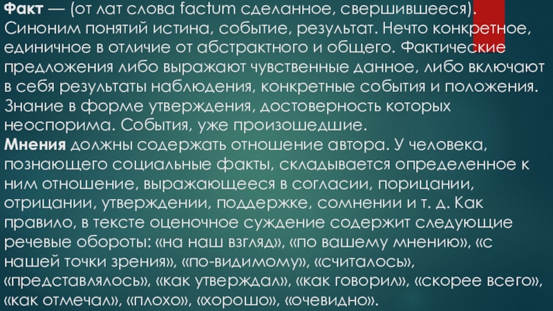 Слайд 2Факт — (от лат слова factum сделанное, свершившееся). Синоним понятий истина,