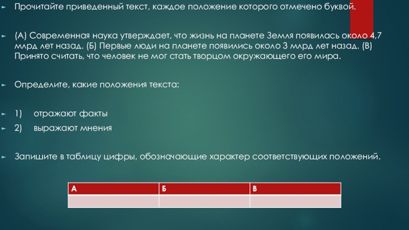 утверждает, что жизнь на планете Земля появилась около 4,7 млрд лет назад. (Б) Первые люди на планете появились около 3 млрд лет назад. (В) Принято считать, что человек не мог стать творцом окружающего его мира.