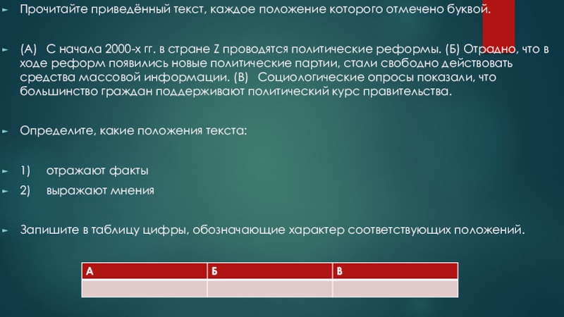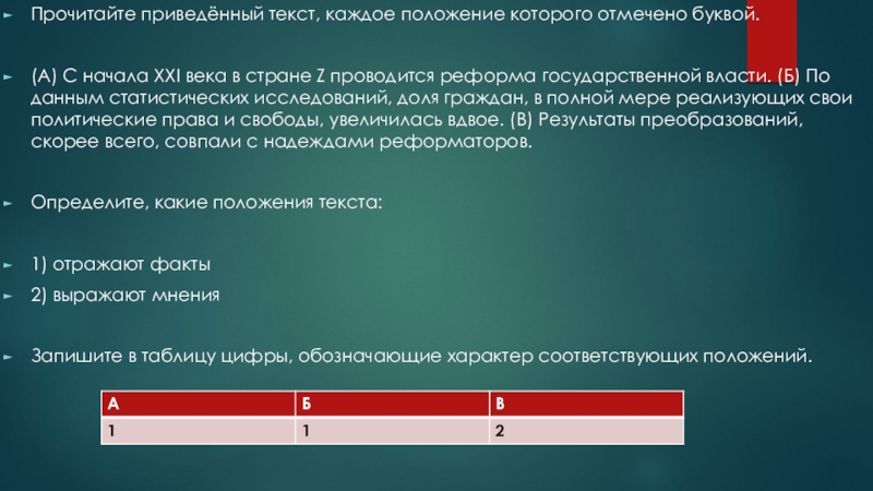 века в стране Z проводится реформа государственной власти. (Б) По данным статистических исследований, доля граждан, в полной мере реализующих свои политические права и свободы, увеличилась вдвое. (В) Результаты преобразований, скорее всего, совпали с надеждами реформаторов.