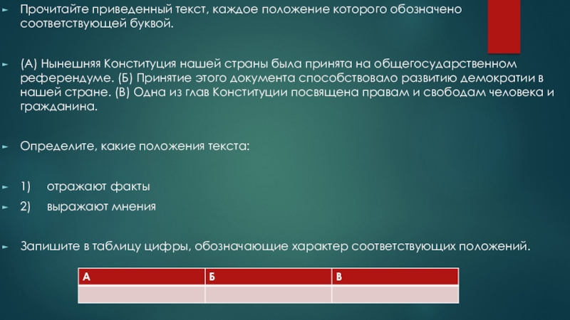 Слайд 26Прочитайте приведенный текст, каждое положение которого обозначено соответствующей буквой.
