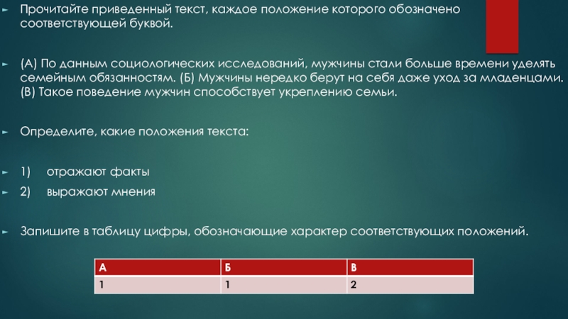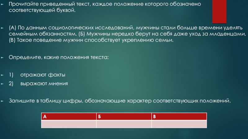 данным социологических исследований, мужчины стали больше времени уделять семейным обязанностям. (Б) Мужчины нередко берут на себя даже уход за младенцами. (В) Такое поведение мужчин способствует укреплению семьи.