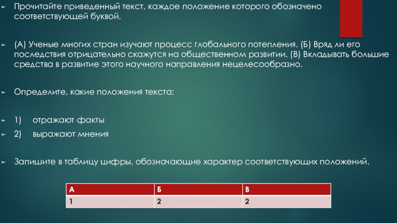 многих стран изучают процесс глобального потепления. (Б) Вряд ли его последствия отрицательно скажутся на общественном развитии. (В) Вкладывать большие средства в развитие этого научного направления нецелесообразно.