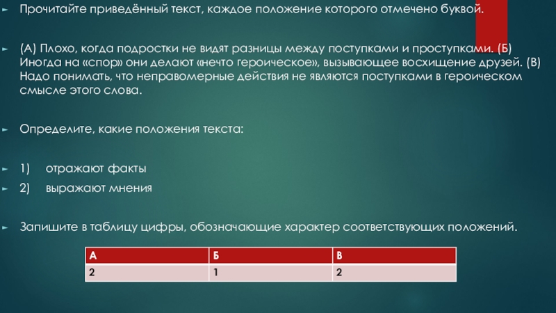 подростки не видят разницы между поступками и проступками. (Б) Иногда на «спор» они делают «нечто героическое», вызывающее восхищение друзей. (В) Надо понимать, что неправомерные действия не являются поступками в героическом смысле этого слова.