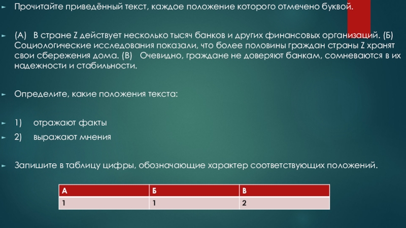 действует несколько тысяч банков и других финансовых организаций. (Б) Социологические исследования показали, что более половины граждан страны Z хранят свои сбережения дома. (B) Очевидно, граждане не доверяют банкам, сомневаются в их надежности и стабильности.