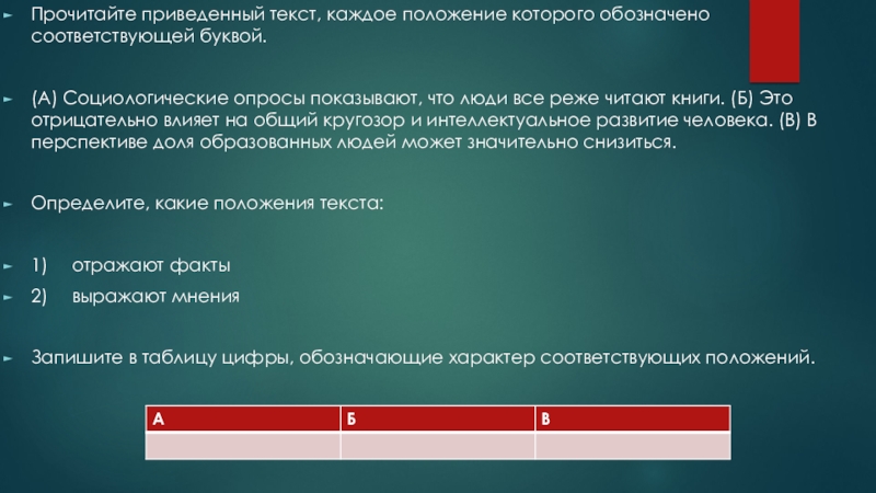 Слайд 50Прочитайте приведенный текст, каждое положение которого отмечено буквой.