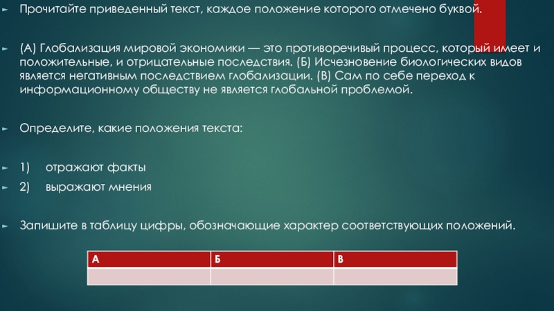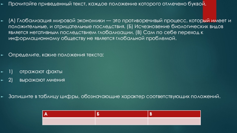 экономики — это противоречивый процесс, который имеет и положительные, и отрицательные последствия. (Б) Исчезновение биологических видов является негативным последствием глобализации. (В) Сам по себе переход к информационному обществу не является глобальной проблемой.