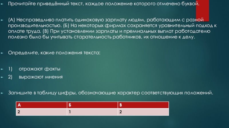 зарплату людям, работающим с разной производительностью. (Б) На некоторых фирмах сохраняется уравнительный подход к оплате труда. (В) При установлении зарплаты и премиальных выплат работодателю полезно было бы учитывать старательность работников, их отношение к делу.
