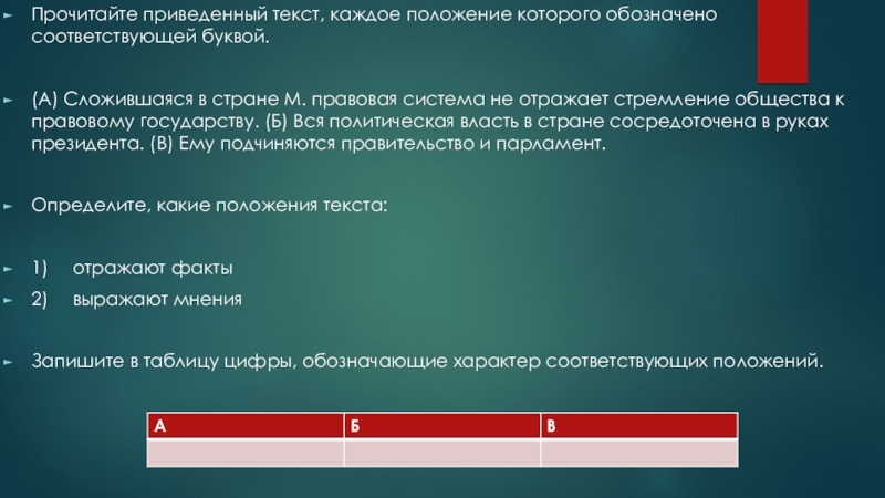 в стране М. правовая система не отражает стремление общества к правовому государству. (Б) Вся политическая власть в стране сосредоточена в руках президента. (В) Ему подчиняются правительство и парламент.