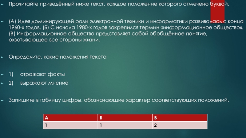 роли электронной техники и информатики развивалась с конца 1960-х годов. (Б) С начала 1980-х годов закрепился термин «информационное общество». (В) Информационное общество представляет собой обобщённое понятие, охватывающее все стороны жизни.
