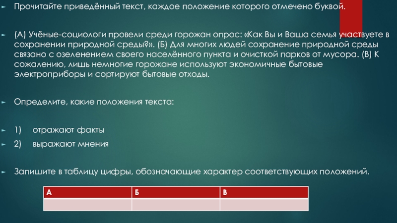 горожан опрос: «Как Вы и Ваша семья участвуете в сохранении природной среды?». (Б) Для многих людей сохранение природной среды связано с озеленением своего населённого пункта и очисткой парков от мусора. (В) К сожалению, лишь немногие горожане используют экономичные бытовые электроприборы и сортируют бытовые отходы.