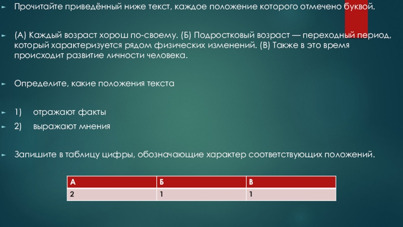 возраст хорош по-своему. (Б) Подростковый возраст — переходный период, который характеризуется рядом физических изменений. (В) Также в это время происходит развитие личности человека.