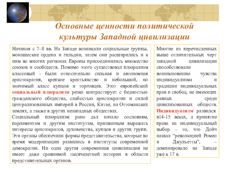 Начиная с 7–8 вв. На Западе возникали социальные группы, монашеские ордена и гильдии, затем они расширились и к ним во многих регионах Европы присоединились множество союзов и сообществ. Помимо этого существовал плюрализм классовый - были относительно сильная и автономная аристократия, крепкое крестьянство и небольшой, но значимый класс купцов и торговцев. Этот европейский социальный плюрализм резко контрастирует с бедностью гражданского общества, слабостью аристократии и силой централизованных империй в России, Китае, на Оттоманских землях, а также в других незападных обществах.