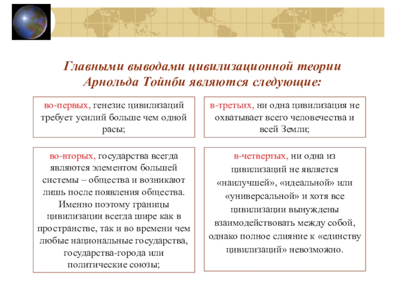 в-четвертых, ни одна из цивилизаций не является «наилучшей», «идеальной» или «универсальной» и хотя все цивилизации вынуждены взаимодействовать между собой, однако полное слияние к «единству цивилизаций» невозможно.