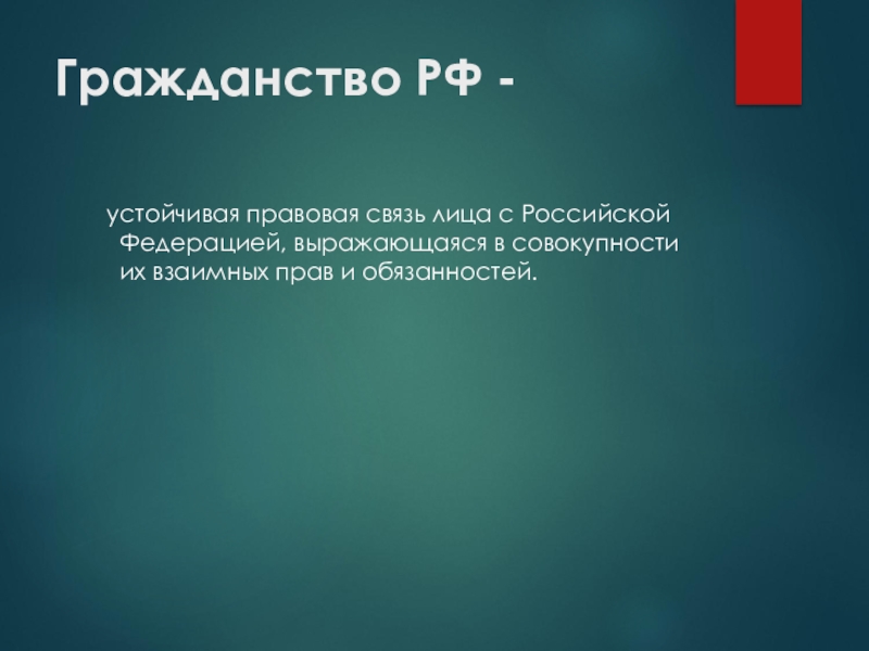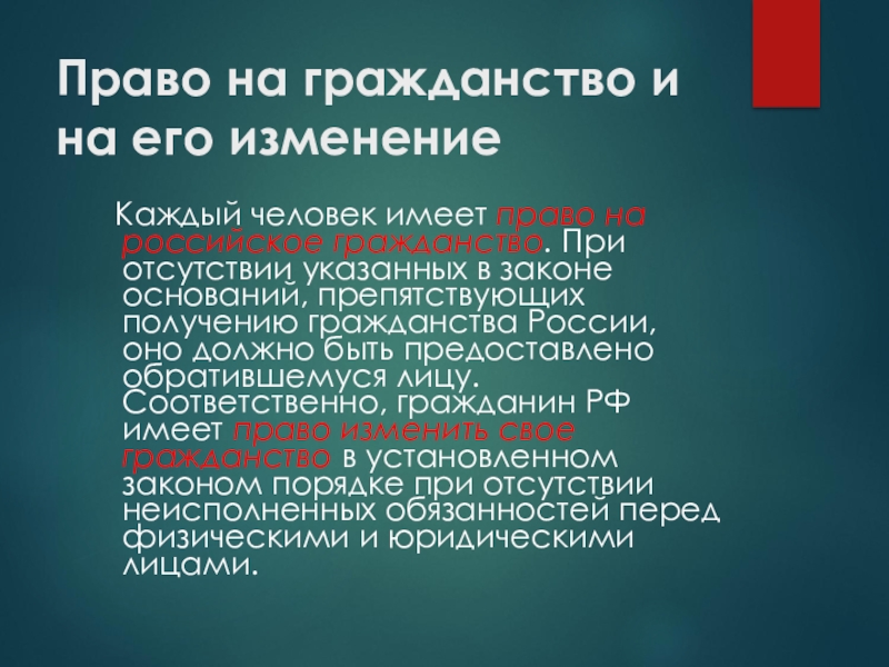 право на российское гражданство. При отсутствии указанных в законе оснований, препятствующих получению гражданства России, оно должно быть предоставлено обратившемуся лицу. Соответственно, гражданин РФ имеет право изменить свое гражданство в установленном законом порядке при отсутствии неисполненных обязанностей перед физическими и юридическими лицами.