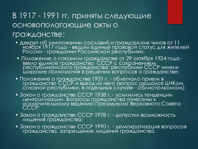 Слайд 8В 1917 - 1991 гг. приняты следующие основополагающие акты о гражданстве: