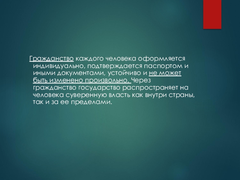 иными документами, устойчиво и не может быть изменено произвольно. Через гражданство государство распространяет на человека суверенную власть как внутри страны, так и за ее пределами.