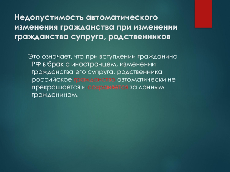 Слайд 13Недопустимость автоматического изменения гражданства при изменении гражданства супруга, родственников