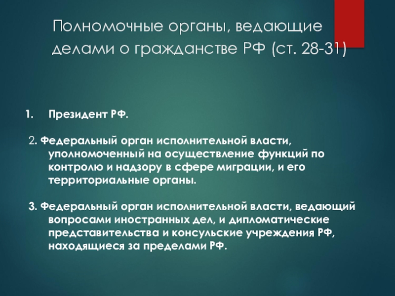 Слайд 17Полномочные органы, ведающие делами о гражданстве РФ (ст. 28-31)