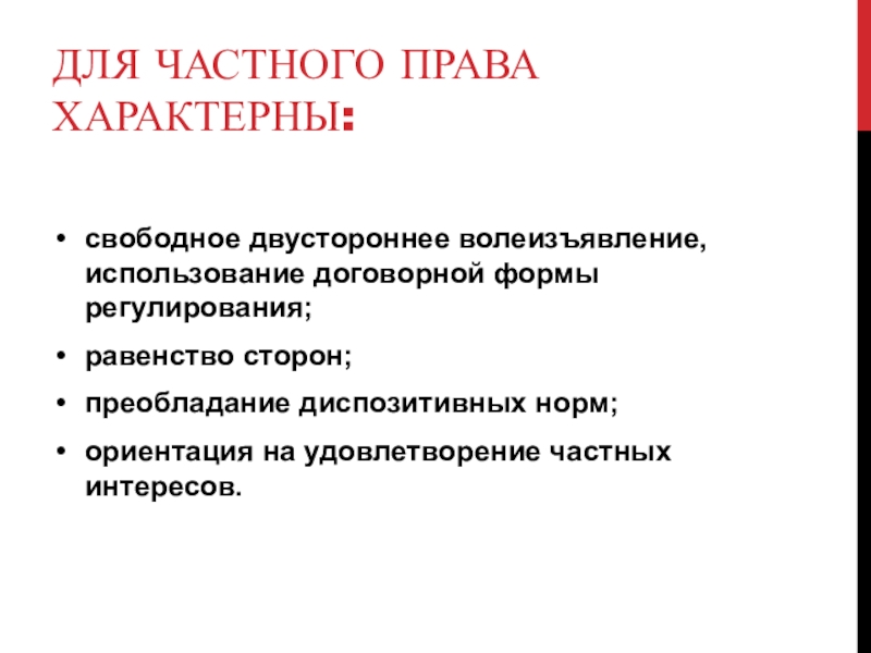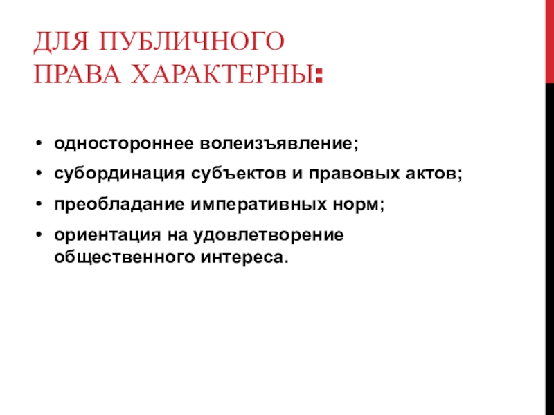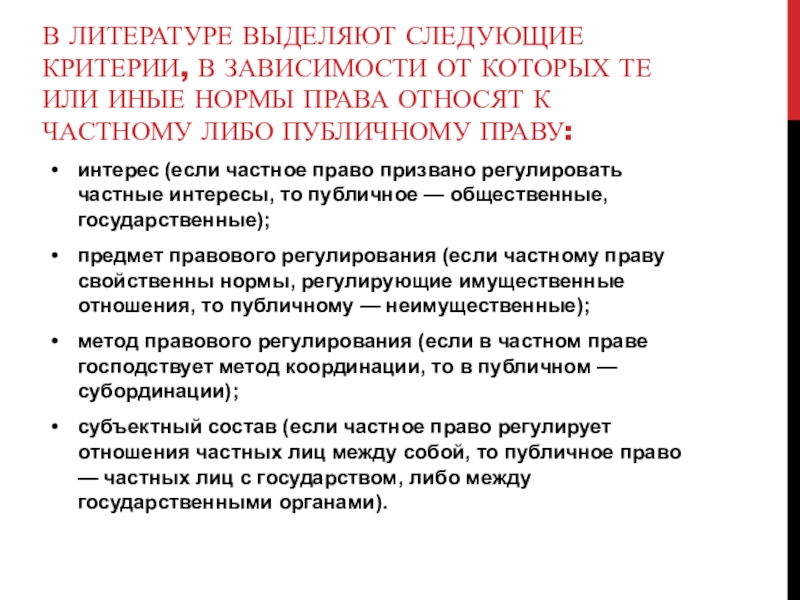 предмет правового регулирования (если частному праву свойственны нормы, регулирующие имущественные отношения, то публичному — неимущественные);