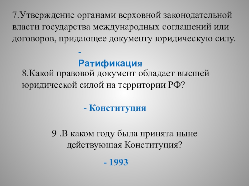 8.Какой правовой документ обладает высшей юридической силой на территории РФ?