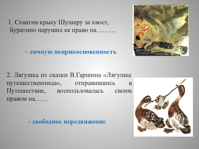 2. Лягушка из сказки В.Гаршина «Лягушка путешественница», отправившись в Путешествие, воспользовалась своим правом на……