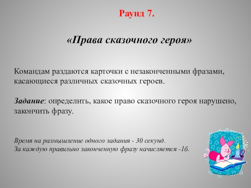 Командам раздаются карточки с незаконченными фразами, касающиеся различных сказочных героев.