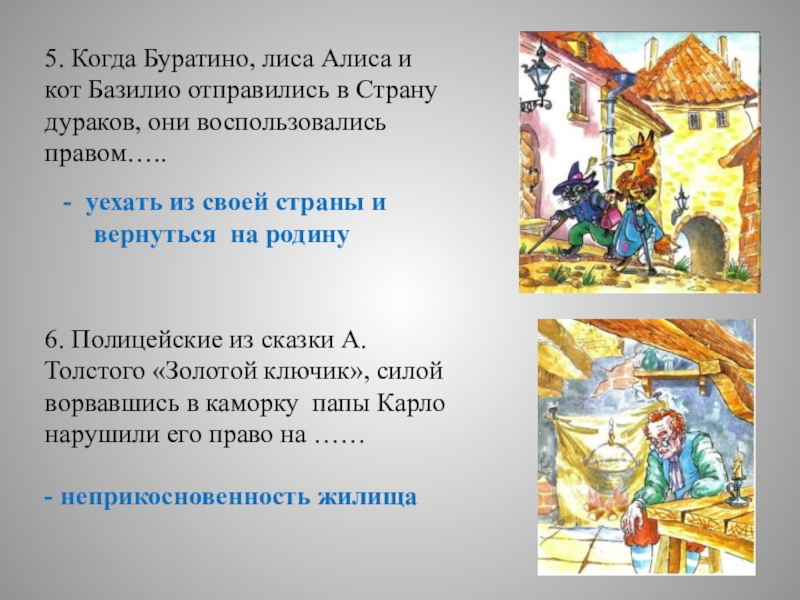 6. Полицейские из сказки А.Толстого «Золотой ключик», силой ворвавшись в каморку папы Карло нарушили его право на ……