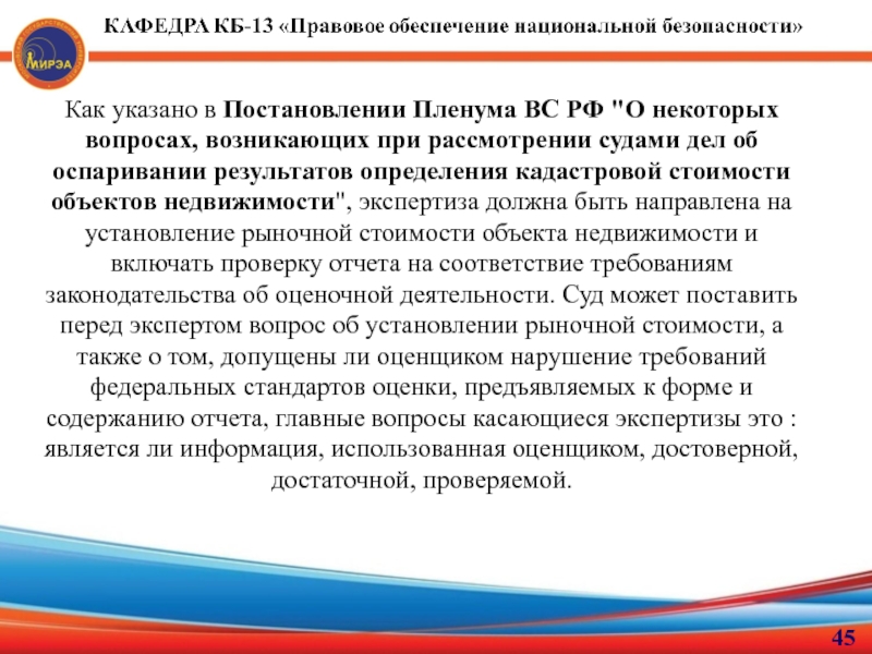 возникающих при рассмотрении судами дел об оспаривании результатов определения кадастровой стоимости объектов недвижимости", экспертиза должна быть направлена на установление рыночной стоимости объекта недвижимости и включать проверку отчета на соответствие требованиям законодательства об оценочной деятельности. Суд может поставить перед экспертом вопрос об установлении рыночной стоимости, а также о том, допущены ли оценщиком нарушение требований федеральных стандартов оценки, предъявляемых к форме и содержанию отчета, главные вопросы касающиеся экспертизы это : является ли информация, использованная оценщиком, достоверной, достаточной, проверяемой.
