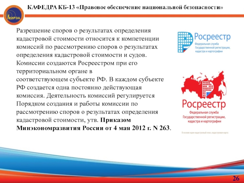 комиссий по рассмотрению споров о результатах определения кадастровой стоимости и судов. Комиссии создаются Росреестром при его территориальном органе в соответствующем субъекте РФ. В каждом субъекте РФ создается одна постоянно действующая комиссия. Деятельность комиссий регулируется Порядком создания и работы комиссии по рассмотрению споров о результатах определения кадастровой стоимости, утв. Приказом Минэкономразвития России от 4 мая 2012 г. N 263.