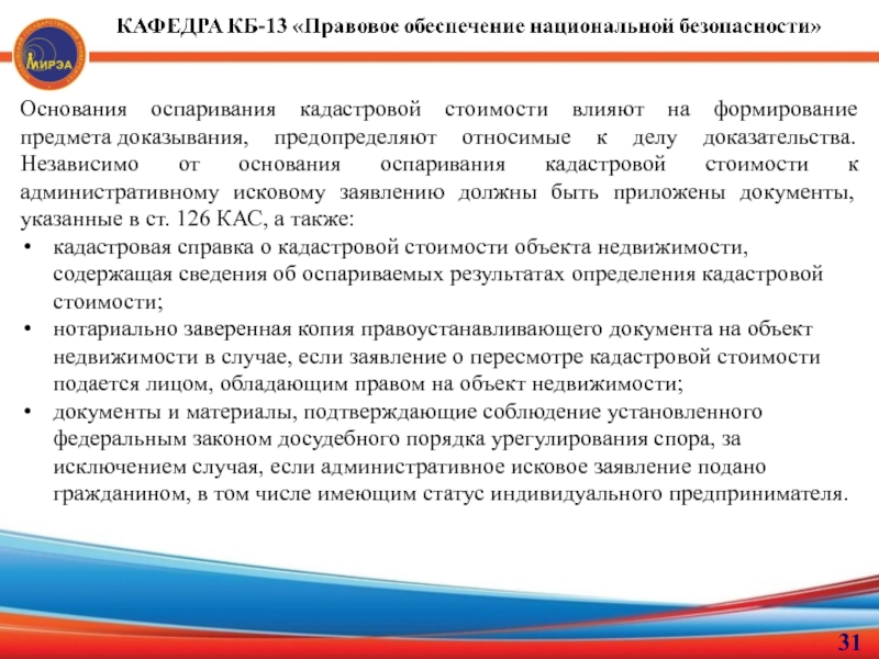 к делу доказательства. Независимо от основания оспаривания кадастровой стоимости к административному исковому заявлению должны быть приложены документы, указанные в ст. 126 КАС, а также: