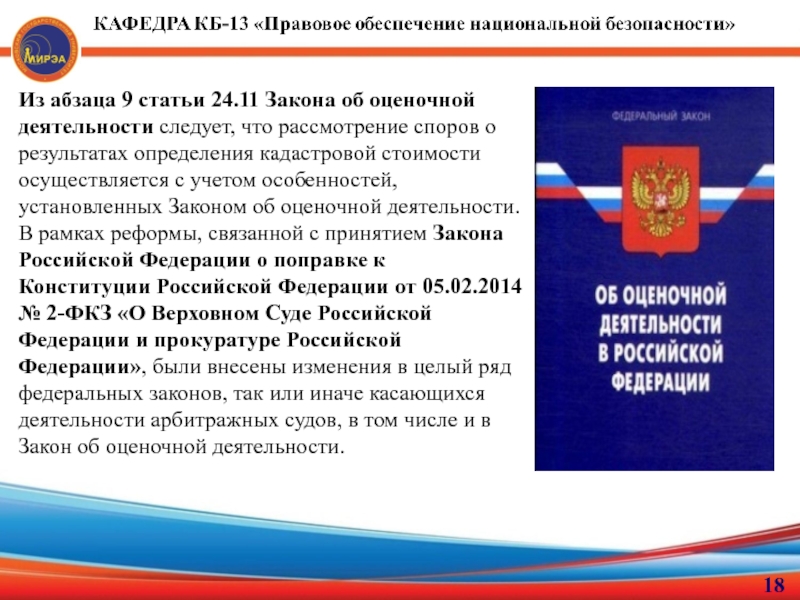 В рамках реформы, связанной с принятием Закона Российской Федерации о поправке к Конституции Российской Федерации от 05.02.2014 № 2-ФКЗ «О Верховном Суде Российской Федерации и прокуратуре Российской Федерации», были внесены изменения в целый ряд федеральных законов, так или иначе касающихся деятельности арбитражных судов, в том числе и в Закон об оценочной деятельности.