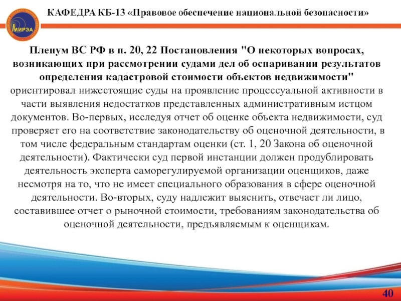 вопросах, возникающих при рассмотрении судами дел об оспаривании результатов определения кадастровой стоимости объектов недвижимости" ориентировал нижестоящие суды на проявление процессуальной активности в части выявления недостатков представленных административным истцом документов. Во-первых, исследуя отчет об оценке объекта недвижимости, суд проверяет его на соответствие законодательству об оценочной деятельности, в том числе федеральным стандартам оценки (ст. 1, 20 Закона об оценочной деятельности). Фактически суд первой инстанции должен продублировать деятельность эксперта саморегулируемой организации оценщиков, даже несмотря на то, что не имеет специального образования в сфере оценочной деятельности. Во-вторых, суду надлежит выяснить, отвечает ли лицо, составившее отчет о рыночной стоимости, требованиям законодательства об оценочной деятельности, предъявляемым к оценщикам.