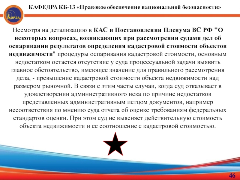 "О некоторых вопросах, возникающих при рассмотрении судами дел об оспаривании результатов определения кадастровой стоимости объектов недвижимости" процедуры оспаривания кадастровой стоимости, основным недостатком остается отсутствие у суда процессуальной задачи выявить главное обстоятельство, имеющее значение для правильного рассмотрения дела, - превышение кадастровой стоимости объекта недвижимости над размером рыночной. В связи с этим часты случаи, когда суд отказывает в удовлетворении административного иска по причине недостатков представленных административным истцом документов, например несоответствия по мнению суда отчета об оценке требованиям федеральных стандартов оценки. При этом суд не выясняет действительную стоимость объекта недвижимости и ее соотношение с кадастровой стоимостью.