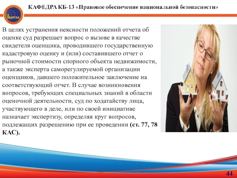 вопрос о вызове в качестве свидетеля оценщика, проводившего государственную кадастровую оценку и (или) составившего отчет о рыночной стоимости спорного объекта недвижимости, а также эксперта саморегулируемой организации оценщиков, давшего положительное заключение на соответствующий отчет. В случае возникновения вопросов, требующих специальных знаний в области оценочной деятельности, суд по ходатайству лица, участвующего в деле, или по своей инициативе назначает экспертизу, определяя круг вопросов, подлежащих разрешению при ее проведении (ст. 77, 78 КАС).