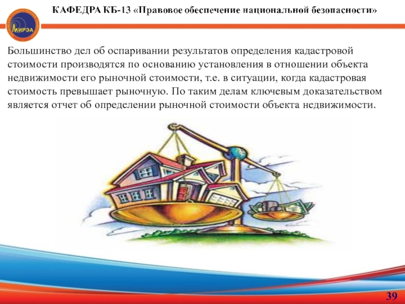 Слайд 39Большинство дел об оспаривании результатов определения кадастровой стоимости производятся по основанию