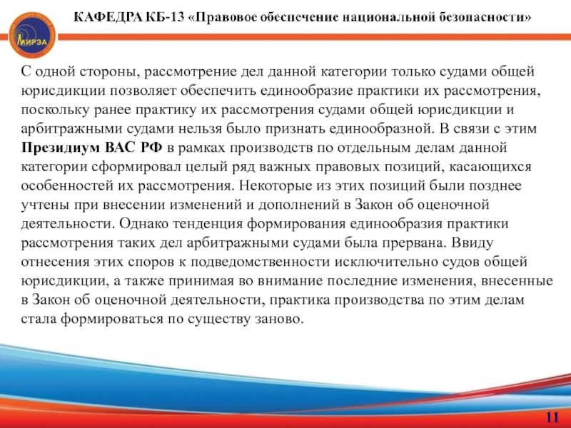 позволяет обеспечить единообразие практики их рассмотрения, поскольку ранее практику их рассмотрения судами общей юрисдикции и арбитражными судами нельзя было признать единообразной. В связи с этим Президиум ВАС РФ в рамках производств по отдельным делам данной категории сформировал целый ряд важных правовых позиций, касающихся особенностей их рассмотрения. Некоторые из этих позиций были позднее учтены при внесении изменений и дополнений в Закон об оценочной деятельности. Однако тенденция формирования единообразия практики рассмотрения таких дел арбитражными судами была прервана. Ввиду отнесения этих споров к подведомственности исключительно судов общей юрисдикции, а также принимая во внимание последние изменения, внесенные в Закон об оценочной деятельности, практика производства по этим делам стала формироваться по существу заново.