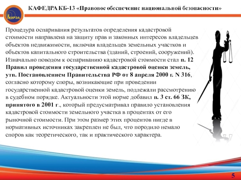 и законных интересов владельцев объектов недвижимости, включая владельцев земельных участков и объектов капитального строительства (зданий, строений, сооружений). Изначально поводом к оспариванию кадастровой стоимости стал п. 12 Правил проведения государственной кадастровой оценки земель, утв. Постановлением Правительства РФ от 8 апреля 2000 г. N 316, согласно которому споры, возникающие при проведении государственной кадастровой оценки земель, подлежали рассмотрению в судебном порядке. Актуальности этой норме добавил п. 3 ст. 66 ЗК, принятого в 2001 г., который предусматривал правило установления кадастровой стоимости земельного участка в процентах от его рыночной стоимости. При этом размер этих процентов нигде в нормативных источниках закреплен не был, что породило немало споров как теоретического, так и практического характера.