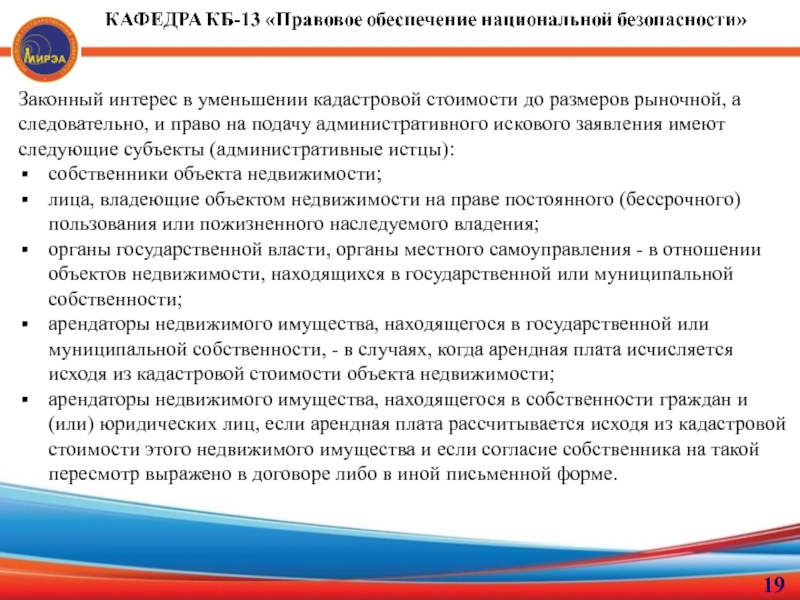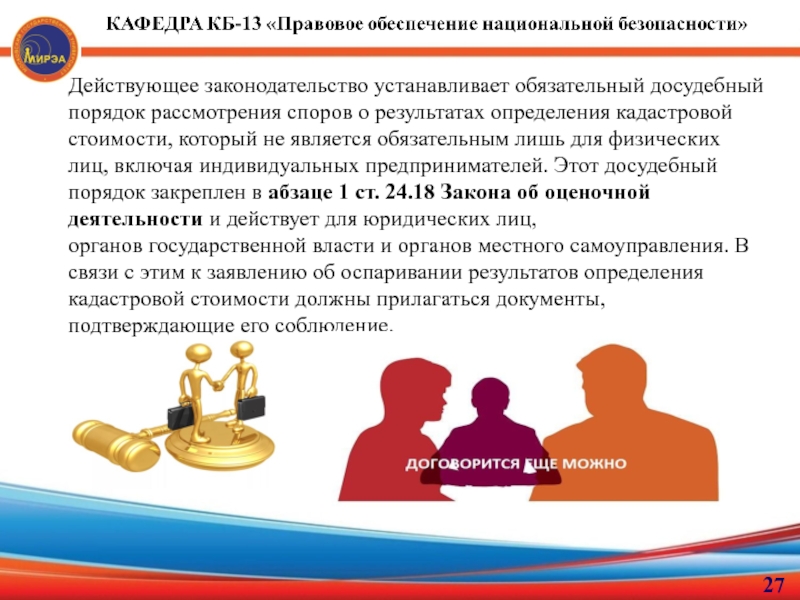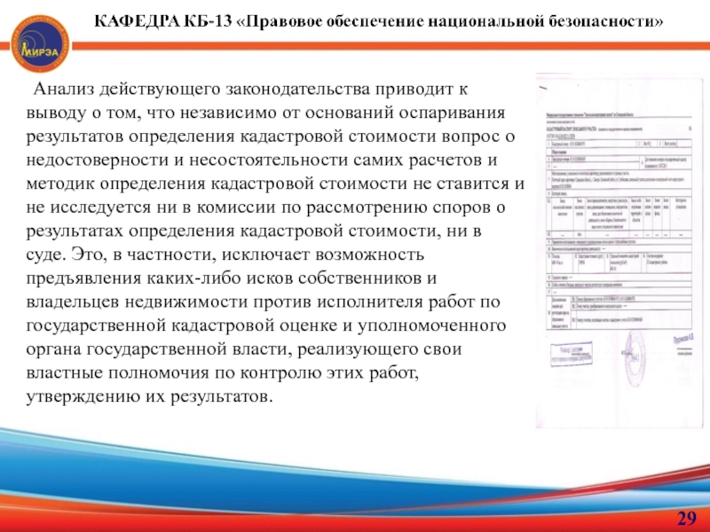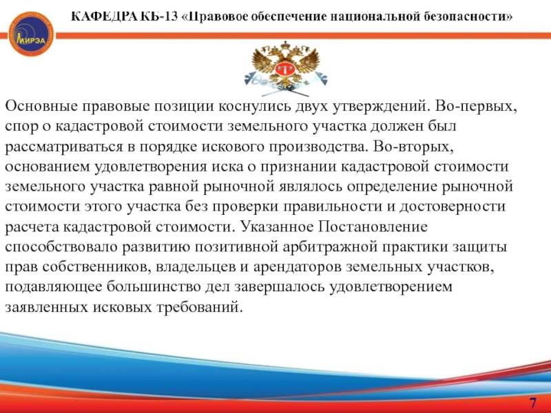 Слайд 7Основные правовые позиции коснулись двух утверждений. Во-первых, спор о кадастровой стоимости