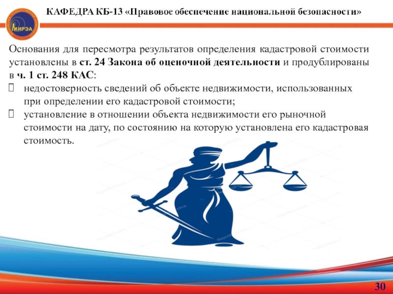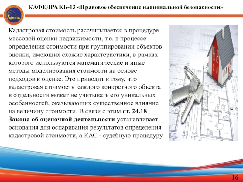 процессе определения стоимости при группировании объектов оценки, имеющих схожие характеристики, в рамках которого используются математические и иные методы моделирования стоимости на основе подходов к оценке. Это приводит к тому, что кадастровая стоимость каждого конкретного объекта в отдельности может не учитывать его уникальных особенностей, оказывающих существенное влияние на величину стоимости. В связи с этим ст. 24.18 Закона об оценочной деятельности устанавливает основания для оспаривания результатов определения кадастровой стоимости, а КАС - судебную процедуру.