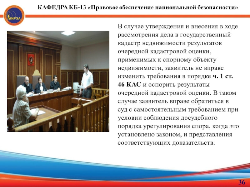 государственный кадастр недвижимости результатов очередной кадастровой оценки, применимых к спорному объекту недвижимости, заявитель не вправе изменить требования в порядке ч. 1 ст. 46 КАС и оспорить результаты очередной кадастровой оценки. В таком случае заявитель вправе обратиться в суд с самостоятельным требованием при условии соблюдения досудебного порядка урегулирования спора, когда это установлено законом, и представления соответствующих доказательств.